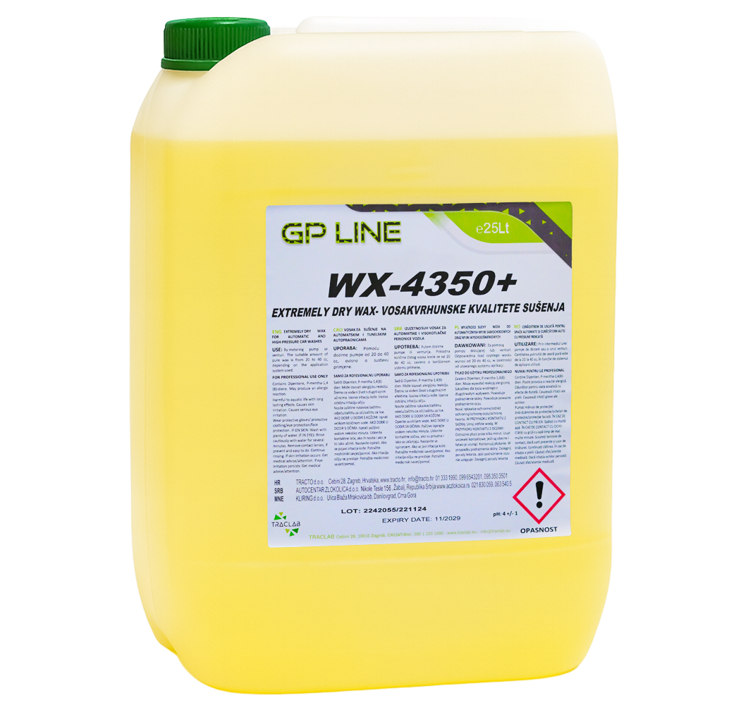 Nuova formulazione di cera che preserva e nutre le superfici verniciate dei veicoli, le gomme e la plastica, conferendo loro un'alta brillantezza. Fornisce anche protezione contro le condizioni atmosferiche e altri fattori come i raggi UV. Lo strato protettivo crea resistenza all'acqua e alla polvere. Ha un profumo unico di aloe vera e genera schiuma durante l'applicazione. Adatto per tutti i tipi di autolavaggi, ma raccomandato per autolavaggi self-service e manuali. Offre ottimi risultati di asciugatura con bassi costi grazie alla minima quantità utilizzata per veicolo.